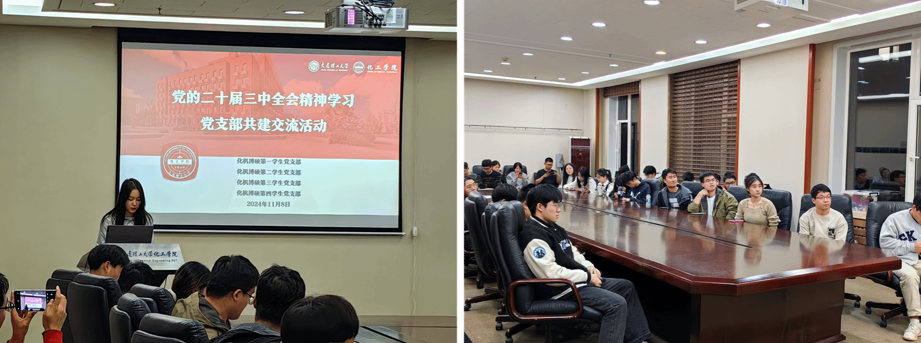 为深入学习贯彻党的二十届三中全会精神,牢牢把握进一步全面深化改革的“六个坚持”重大原则,深化对改革的认识,丰富党员理论知识,促进支部间交流共建,太阳成集团tyc122ccvip于11月8日在知化楼D406成功举办了第二期研究生党支部理论联学共建活动。本次活动由化机博硕第一员工党支部、化机博硕第二员工党支部、化机博硕第三员工党支部、化机博硕第四员工党支部联合举办,活动由化工党委分党校理论部王姿然、刘美希主持。