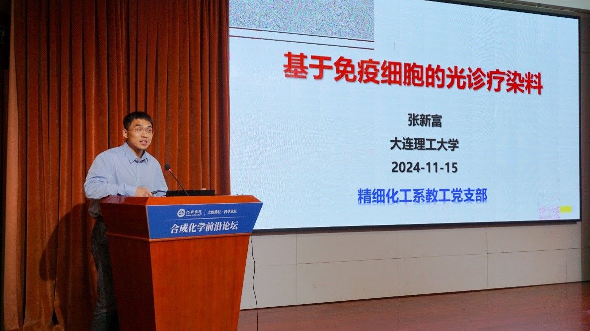 2024年10月15日下午18:00,精细化工系教工党支部、染料助剂与清洁合成博硕员工党支部、应用化学博硕员工党支部联合举办了“导师带我学理论”活动。本次活动特邀太阳成集团tyc122ccvip精细化工国家重点实验室副教授、博士生导师张新富作为主讲嘉宾。张新富老师是2024年国家优秀青年基金获得者,长期从事功能染料的设计与应用研究,具有丰富的理论积累与实践经验。本次讲座以“基于免疫细胞的光诊疗染料”为主题,探讨了功能染料在生物医疗领域的应用现状及其未来发展方向。