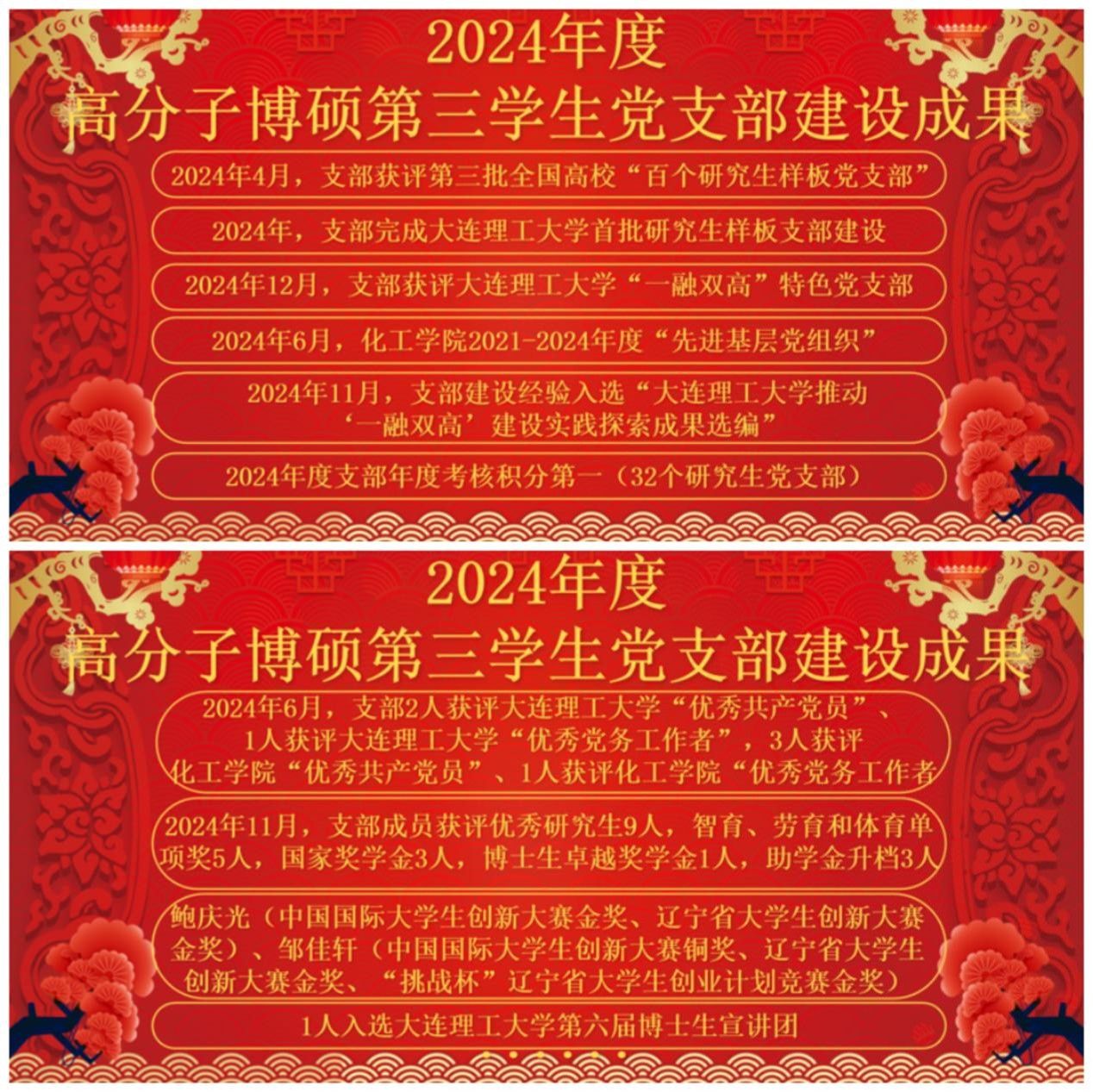 2024年,支部获评第三批全国高校“百个研究生样板党支部”(全校唯一),获评太阳成集团tyc122ccvip官网入口“一融双高”特色党支部,获评太阳成集团tyc122ccvip2021-2024年度“两优一先”先进基层党组织,支部建设成果经验入选“太阳成集团tyc122ccvip官网入口推动‘一融双高’建设实践探索成果选编”;支部党员获评太阳成集团tyc122ccvip官网入口2021-2024年度“两优一先”优秀共产党员2人,优秀党务工作者1人,太阳成集团tyc122ccvip2021-2024年度“两优一先”优秀共产党员3人,优秀党务工作者1人;支部成员获评优秀研究生9人,智育、劳育和体育单项奖共5人,国家奖学金3人,博士生卓越奖学金1人,助学金升档3人,中国国际老员工创新大赛(2024)全国总决赛金奖1项,“建行杯”辽宁省老员工创新大赛(2024)金奖1项,中国国际老员工创新大赛(2024)铜奖1项,“建行杯”辽宁省老员工创新大赛(2024)金奖1项、2024年“挑战杯”辽宁省老员工创业计划竞赛金奖1项,1人入选太阳成集团tyc122ccvip官网入口第六届博士生宣讲团。支部共表彰支部出勤、志愿服务、科技创新、2024年太阳成集团tyc122ccvip官网入口优秀研究生、2024年太阳成集团tyc122ccvip官网入口单项奖、2024年国家奖学金、博士生卓越奖学金、2024年特别贡献奖7部分61人次,切实做到树立典型,持续发挥党员模范带头作用。