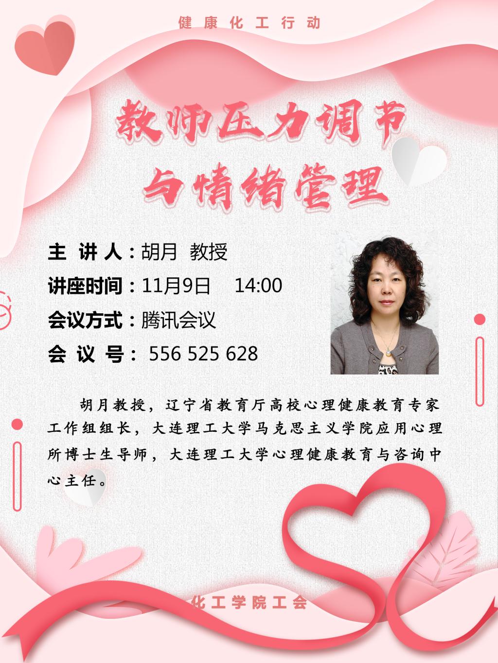 公司工会定于11月9日(下周一)举办健康化工行动——教师压力调节与情绪管理 主题讲座。主讲人:胡月 教授讲座时间:11月9日(下周一)14:00-16:00讲座形式:线上会议
