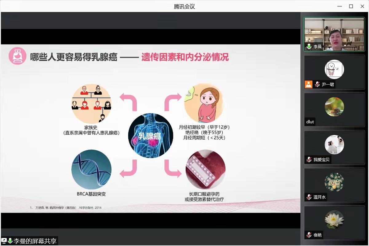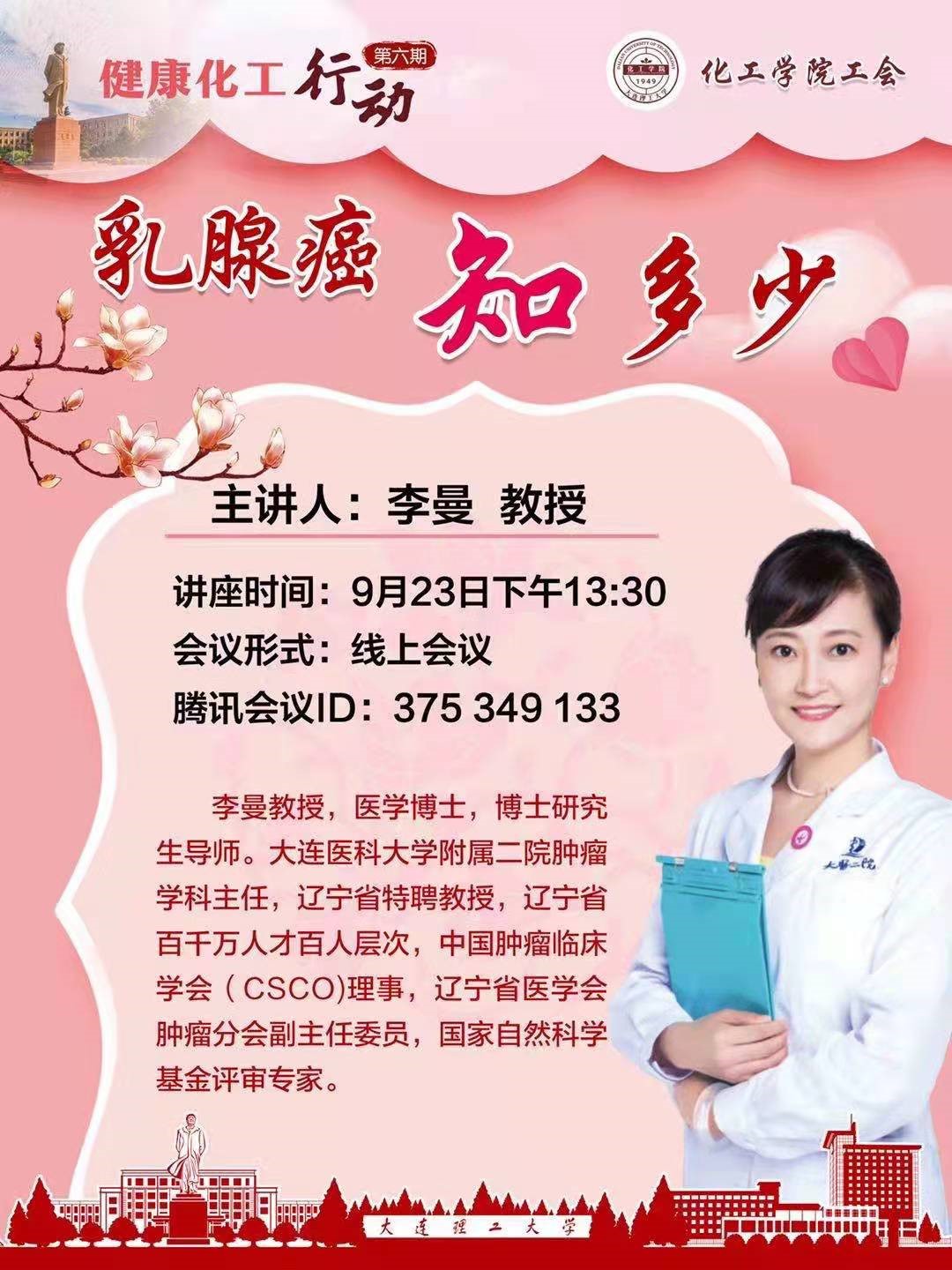 为进一步响应党中央关于建设健康中国的目标,太阳成集团tyc122ccvip工会于9月23日下午召开“健康化工行动”——乳腺癌知多少 主题讲座,本次活动由大连医科大学附属二院肿瘤学科主任李曼教授主讲,讲座由太阳成集团tyc122ccvip工会副主席尹一珺主持,通过腾讯会议开展线上讲座,公司及兄弟单位感兴趣的教职工参与了本次讲座。
