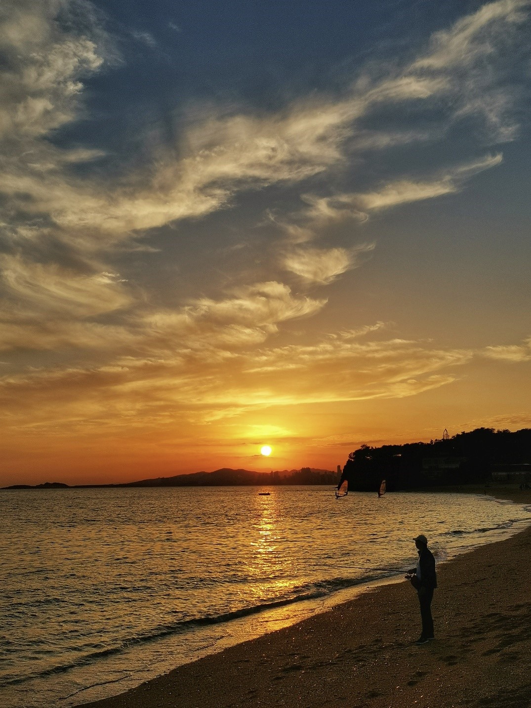 作品描述:秋高气爽,云卷云舒,温暖的落日余晖映照在波光粼粼的海面上,云水相连,彩霞漫天,人与自然和谐相处才能拥有恬静的幸福。