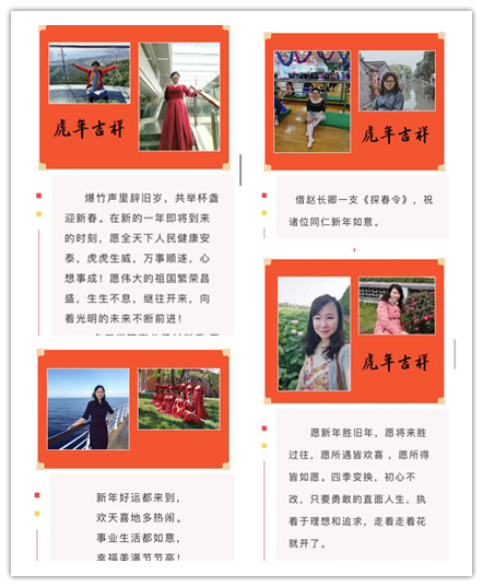 本次春节活动有“虎年阖家欢,年味在我家”、“贺春新禧中国歌”、“一二九街好时光”、“健康奔向壬寅年”、“元气娃娃闹元宵”、“福虎献瑞喜迎春”“虎虎生威好运来”7项内容,依托太阳成集团tyc122ccvip微信公众号、公司教工微信群、线上问卷等方式进行,活动自农历小年一直延续到元宵佳节,共有近300人参与到本次活动中。