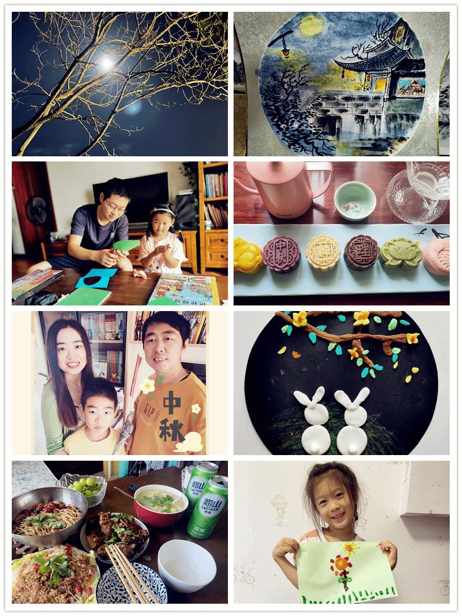 在“中秋话团圆”主题作品征集环节,教职工们纷纷分享了与家人、朋友共同庆祝中秋佳节的温馨照片。有的老师晒出了自己的全家福,他们认真筹备家宴,亲手制作了中秋月饼,记录了幸福的团圆时刻;有的老师在闲暇时光陪伴孩子成长,与宝贝共同制作了中秋主题手工。粘土捏塑的桂花、玉兔和向阳花朵形象生动,优秀的传统文化正悄无声息地在一颗颗稚嫩的心灵生根发芽;公司部分教师在此次疫情封校之时毅然选择驻守工作岗位,不能与家人团聚,他们通过文字表达了对家人的思念和感谢;中秋节恰逢教师节,一些老师借此机会心怀皓月,致敬师恩。
