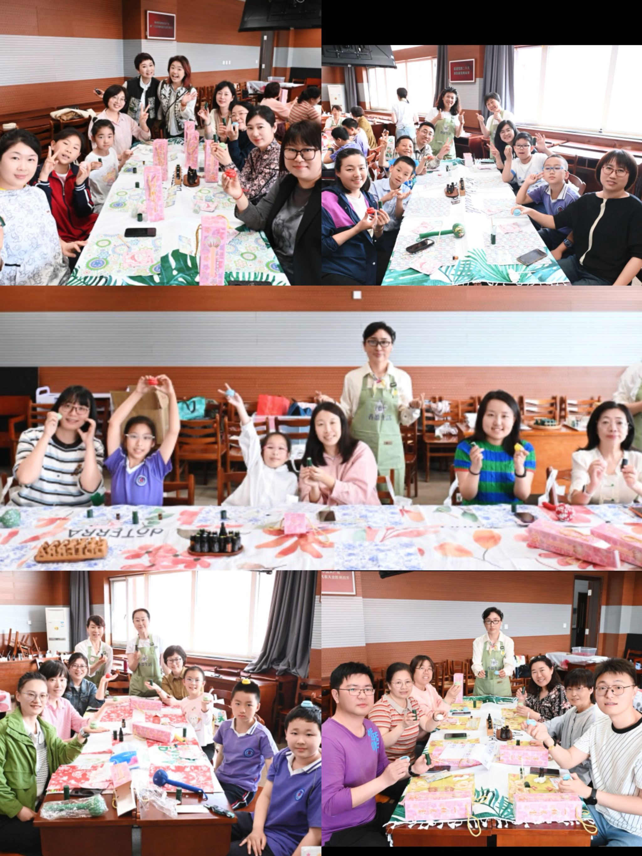 活动现场氤氲着传统韵味与现代活力。木质长桌上陈列着天然蜂蜡、定制精油、艾草经络锤等专业物料,瞬间唤醒教职工家庭对传统节俗的深度感知。通过活动,使教职工家庭对端午知识有了更深的了解。手作环节中,亲子搭档默契配合,父母执滴管引导调配疼痛乳霜,孩童们专注地将驱蚊香膏注入模具。在艾草清苦混合柑橘芬芳流淌间,传统工艺的温度透过指尖传递至心间。