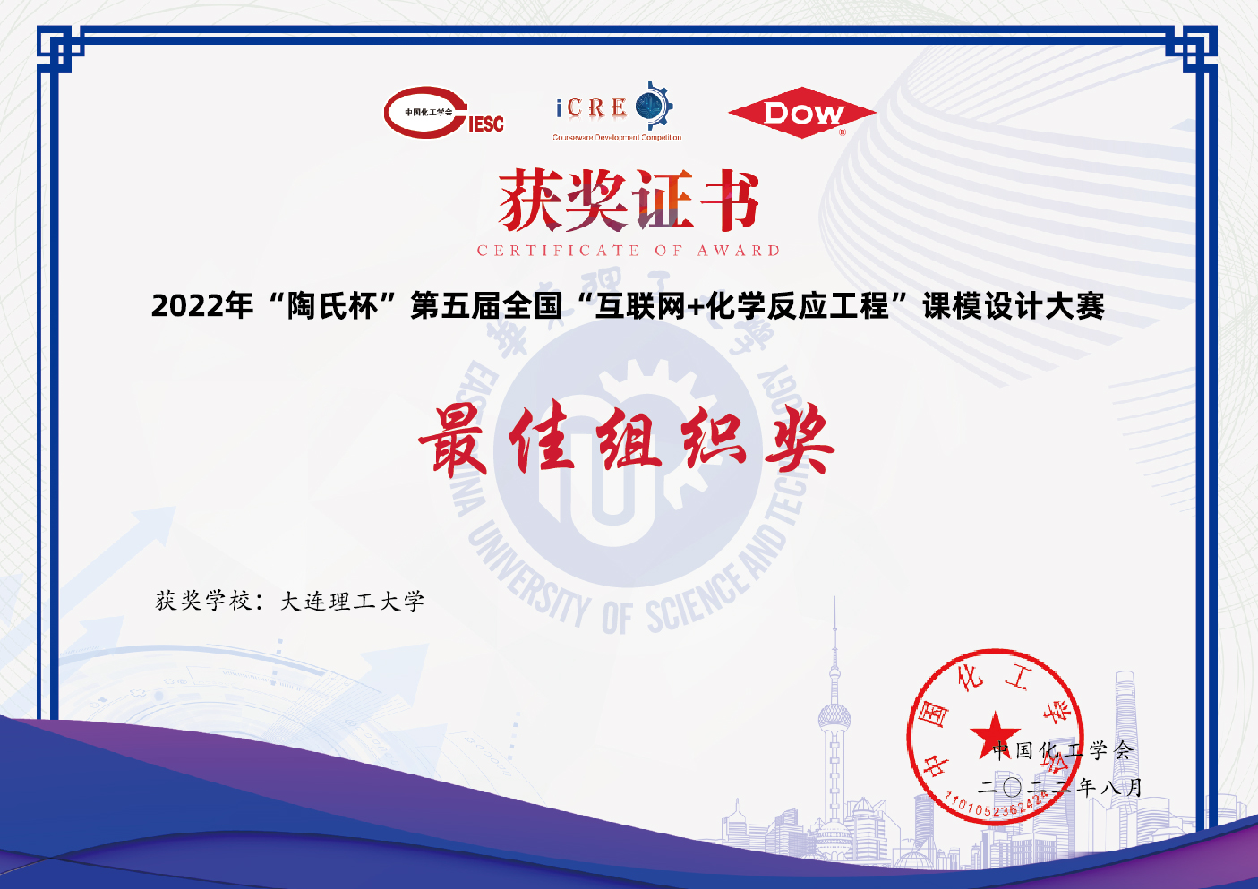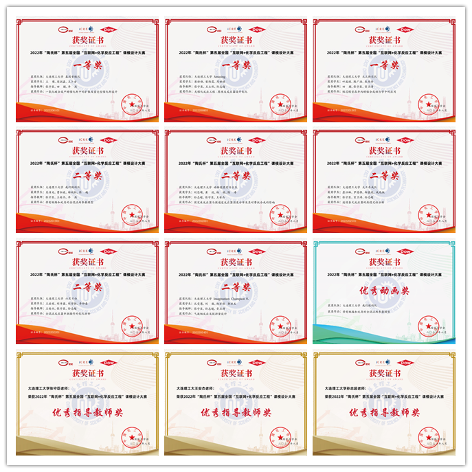 2022年8月23日,由中国化工学会主办,华东理工大学承办的2022年 “陶氏杯”第五届全国“互联网+化学反应工程”课模设计大赛落下帷幕。本届比赛共有来自25个省市自治区、84所高等院校、354支队伍报名参加,本届比赛是历届参赛作品数量最多、作品水平最高的一届,大赛竞争十分激烈。经过专家初评、终评和会议评审等程序,评出作品奖项125项(一等奖18项、二等奖38项、三等奖62项、鼓励奖7项),优秀案例奖5项,优秀动画奖5项,最佳组织奖7项,优秀指导教师奖10名。公司有八支队伍在强手如林的参赛队伍中脱颖而出获得佳绩,共获得一等奖三项、二等奖五项、优秀动画奖一项、三名教师获得了优秀指导教师奖,同时公司还获得了最佳组织奖,在获奖数量和获奖等级上在所有参赛公司中都居于前列。下面是公司获得的奖项和证书: